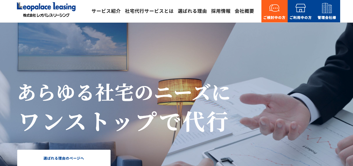 日本で初めて社宅代行を始めたパイオニアで、全国ネットワークかつ社宅規程チェックや原状回復費精査で企業側視点のサービスを提供 | レオパレス物件をはじめ、家具・家電付き社宅を全国で紹介可能。物件決定後の契約金を即日立替できるなどスピーディーな対応が強みで、急な転勤や単身赴任にも柔軟に対応できる | 全国の提携不動産ネットワークと専用WEBシステム「RELO-NET」活用で、転勤・引越しのトータル管理とコスト削減を実現 |