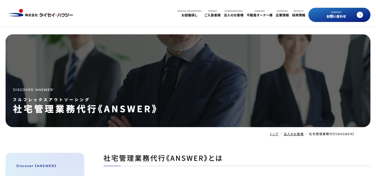 日本で初めて社宅代行を始めたパイオニアで、全国ネットワークかつ社宅規程チェックや原状回復費精査で企業側視点のサービスを提供 |